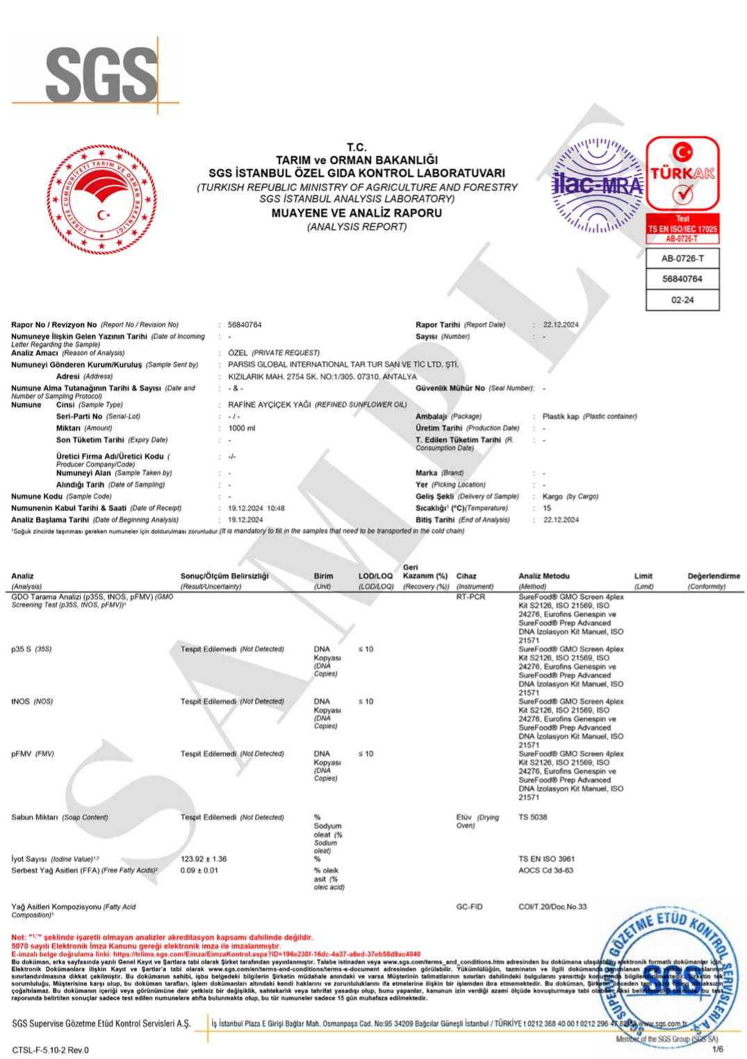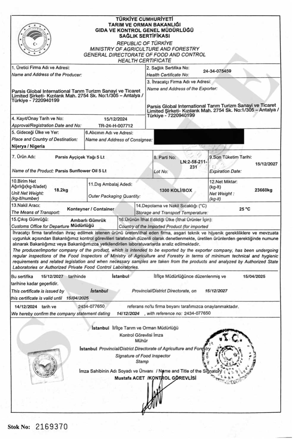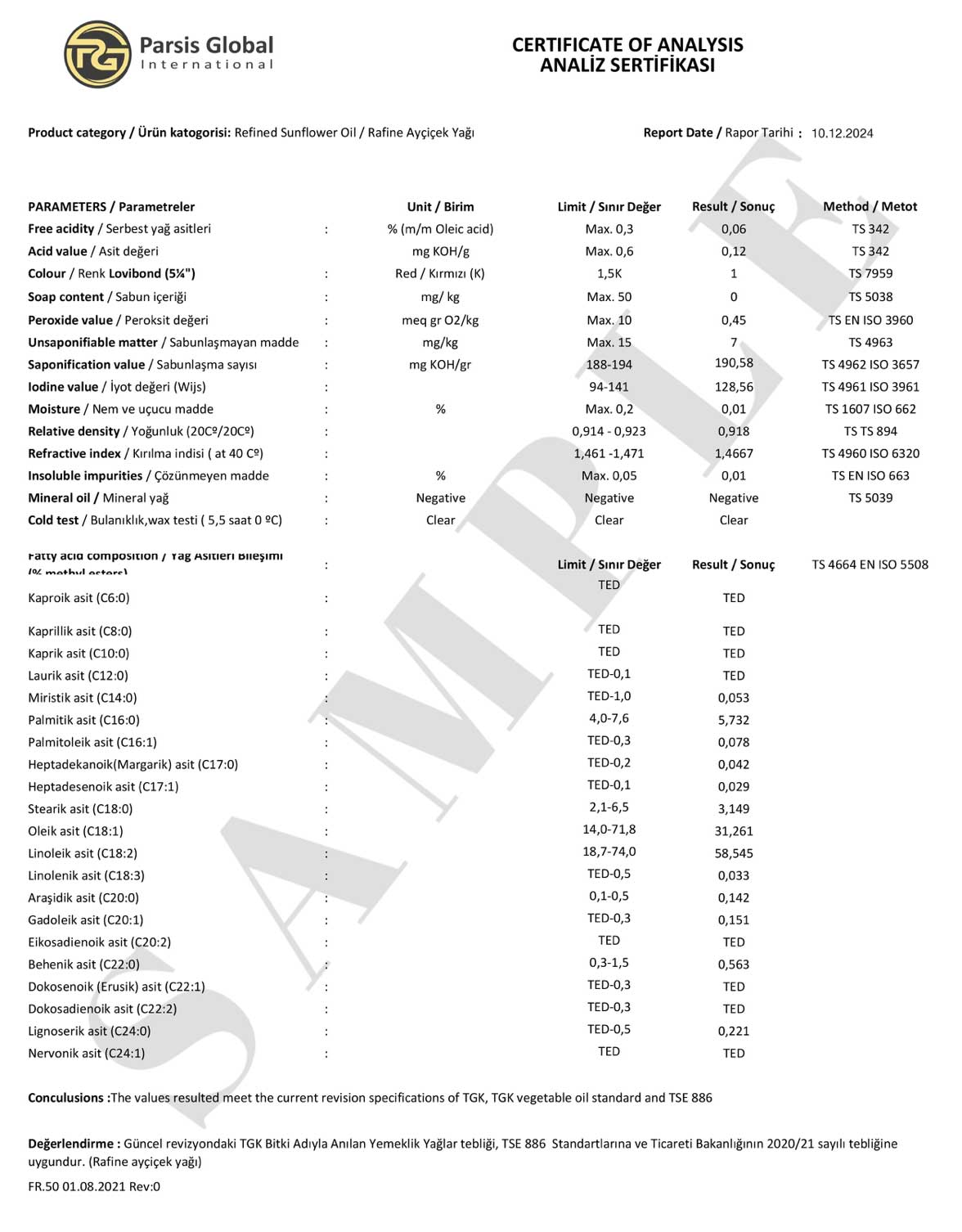 Parsis Sunflower Oil is a product that has been produced according to high-quality standards and has undergone meticulous inspections. On this page, you can find important documents that prove the quality and safety of our product. With international certifications such as the Analysis Certificate, SGS Certificate, and Health Certificate, we once again confirm that Parsis Sunflower Oil has passed quality control processes at every stage and has been produced with your health in mind. The certificates we provide are just examples and are specially prepared for each of our customers. These certificates further prove the trust we offer and the compliance of our product with international standards.